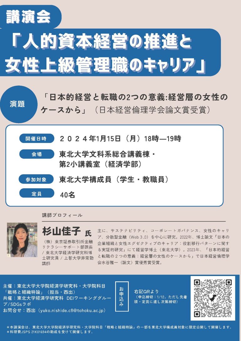 【学内イベント】女性のキャリアに関する講演会・ワークショップ「人的資本経営の推進と女性上級管理職のキャリア」(2023/1/15)