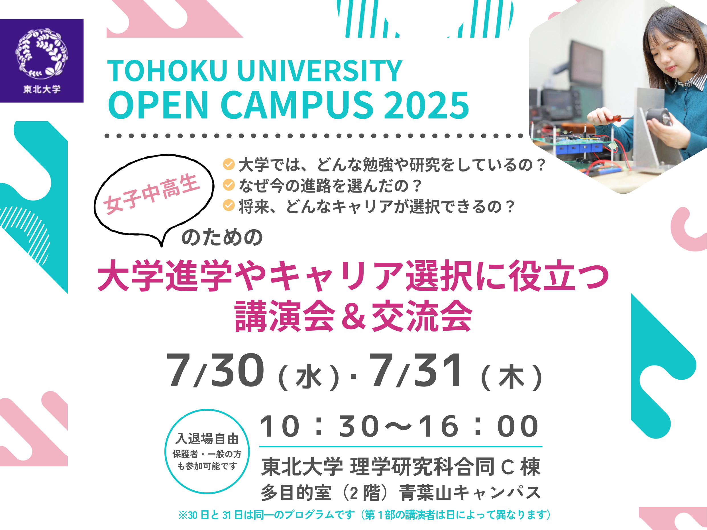 2025年6月23日 【オープンキャンパス】女子中高生のための大学進学やキャリア選択に役立つ講演会&交流会(2025/7/30-7/31開催) イベント SA , 教員 , イベント , 一般 , 在学生 , センターイベント , 中高生 , 小学生
