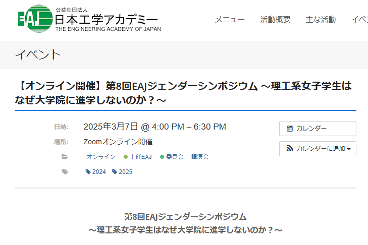 2025年2月10日 【イベント】第8回EAJジェンダーシンポジウム ~理工系女子学生はなぜ大学院に進学しないのか?~(2025/3/7 オンライン開催) イベント 教員 , イベント , 一般 , 在学生 , 職員