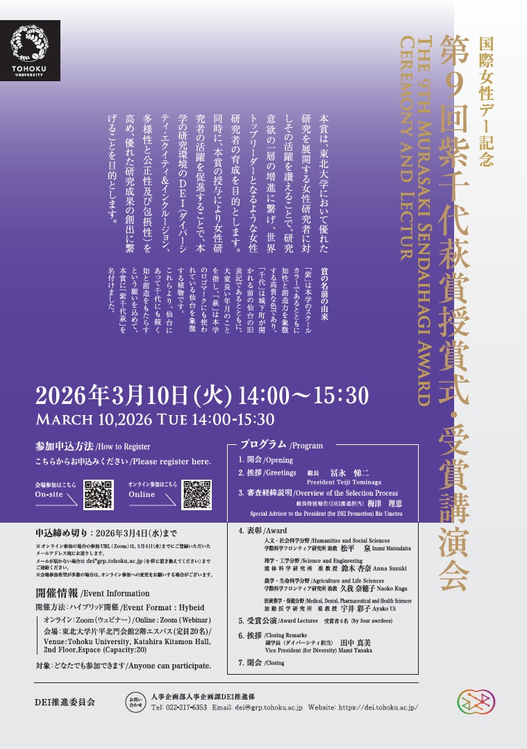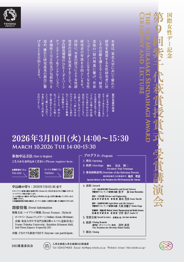 第9回東北大学優秀女性研究者賞「紫千代萩賞」授賞式・受賞講演会をハイブリッドで開催いたします。本賞は、東北大学において優れた研究を展開する女性研究者に対しその活躍を讃えることで、研究意欲の一層の増進に繋げ、世界トップリーダーとなるような女性研究者の育成を目的とします。同時に、本賞の授与により女性研究者の活躍を促進することで、本学の研究環境のDEI(ダイバーシティ・エクイティ&インクルージョン、多様性と公正性及び包摂性)を高め、優れた研究成果の創出に繋げることを目的とします。