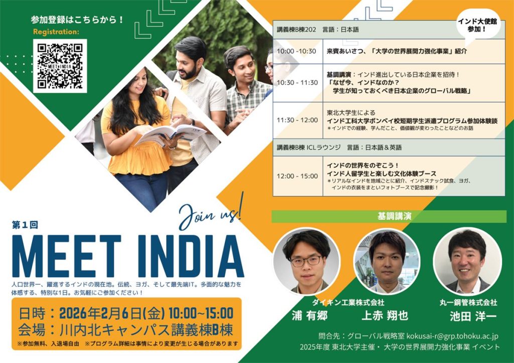 2026年2月6日(金)にインドについて学び、触れることができるイベント「MEET INDIA」を開催いたします。インドでビジネスを展開する日本企業による基調講演やインド人留学生が語るインド、インド文化を体験できるブースを設け、多くの方々にインドを肌で感じていただくためのイベントです。皆様のご参加をお待ちしております!