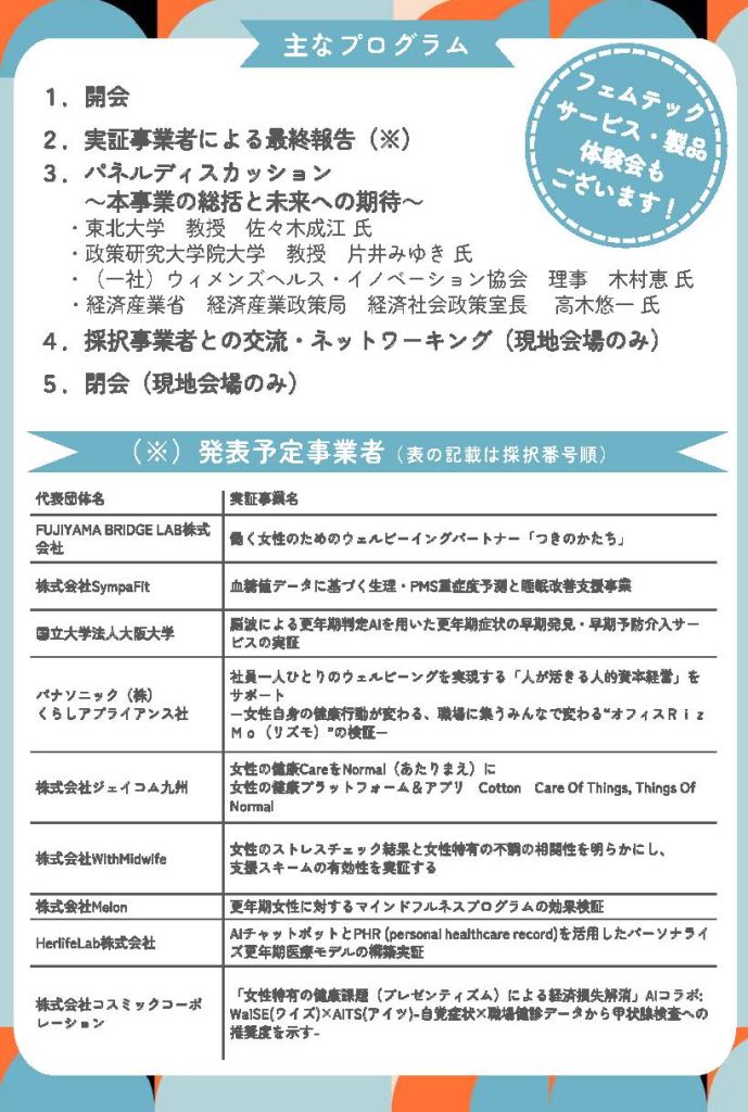 参加資格: 女性活躍の推進や健康経営・フェムテックの導入に関心のある事業者様、自治体様 等
