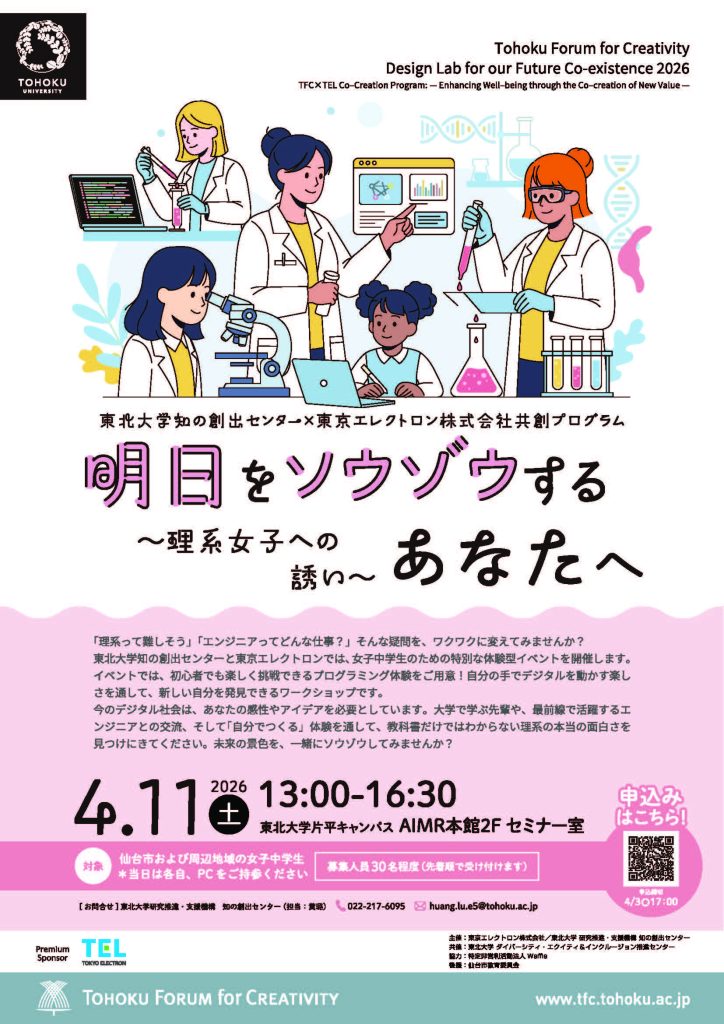 「理系って難しそう」「エンジニアってどんな仕事?」そんな疑問を、ワクワクに変えてみませんか? 東北大学知の創出センターと東京エレクトロンでは、女子中学生のための特別な体験型イベントを開催します。イベントでは、初心者でも楽しく挑戦できるプログラミング体験をご用意!自分の手でデジタルを動かす楽しさを通して、新しい自分を発見できるワークショップです。今のデジタル社会は、あなたの感性やアイデアを必要としています。大学で学ぶ先輩や、最前線で活躍するエンジニアとの交流、そして「自分でつくる」体験を通して、教科書だけではわからない理系の本当の面白さを見つけにきてください。未来の景色を、一緒にソウゾウしてみませんか?