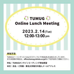 TUMUG Online Lunch Meetingは、新型コロナウイルス感染拡大防止をきっかけにスタートしました。東北大学の女性研究者のネットワークの形成及び実質的な学際融合研究等への発展を目指し、今後も定期的に開催していく予定です。
