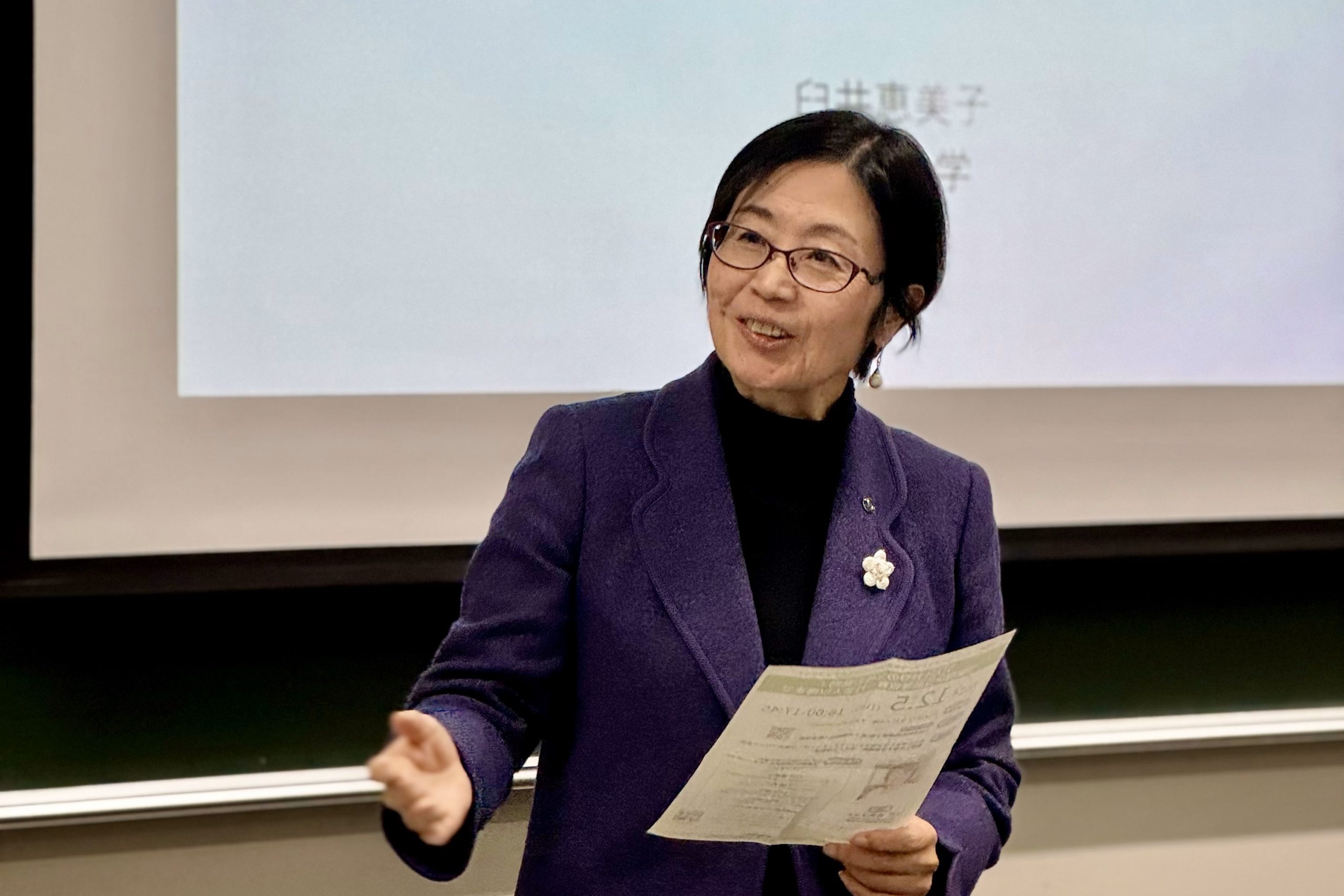 臼井教授は、これまで実施した「理工系分野卒業者の就業における男女の賃金格差」、「高校1年生の生徒と保護者向けのアンケート調査」、「小中学生の保護者向けの理科実験教室関するアンケート」という三つの調査分析を紹介し、女子学生の理科ばなれがかなり早い段階から親や社会の無意識のバイアスによって進んでいる実態を話しされ、公教育の中で理科にたくさん触れられる機会を提供することが大事であると主張しました。