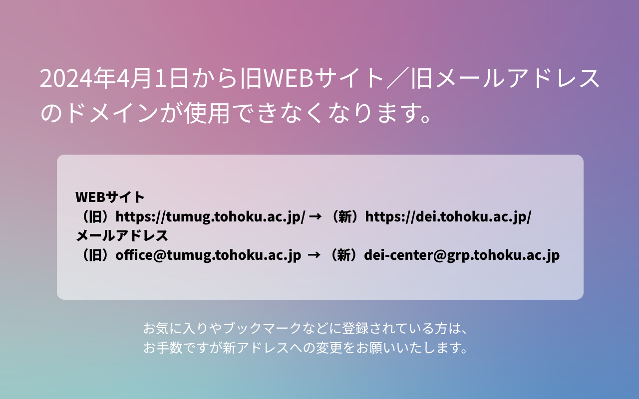 一覧 イベント ニュース 各種公募 お知らせ 2023年12月4日 重要なお知らせ ニュース 2023年12月1日 【報告】センター・サインが新くなりました ニュース 広報 , 活動報告 2023年12月1日 【ご案内】朝日新聞に田中真美 DEI推進センター長のコメントが掲載されました(2023/11/27掲載) ニュース 2023年11月24日 【報告】みやぎにじいろパレード 2023 – に参加しました (2023/11/19) ニュース 活動報告 2023年11月24日 【報告】第30回 TUMUG Online Lunch Meeting(2023/11/14 オンライン開催) ニュース 活動報告 2023年11月16日 【受賞】市川温子教授(理学研究科物理学専攻)が2023年度仁科記念賞を受賞 ニュース 2023年11月16日 【受賞】細田 千尋 准教授(情報科学研究科)が<2023年度JWEF女性技術者に贈る奨励賞 審査員特別賞>を受賞 ニュース 2023年11月15日 【報告】DEI推進センター共催の「ジェンダーと多様性からの災害リスク削減と気候変動」公開シンポジウムが開催されました。(2023/11/13開催) ニュース 活動報告 2023年11月2日 【報告】東北大学サイエンス・アンバサダー&サイエンスシーカーと科学を楽しもう!片平まつり2023(2023/10/7開催) ニュース 活動報告 , 小学生 , SA 2023年10月30日 【ご案内】DEI推進センターのニュースレター第1号を発刊しました。 ニュース 2023年10月19日 【報告】荒木 由布子 教授(情報科学研究科)が “Encounter and Journey with Statistics”International Day of Women in Statistics and Data Science, の講演で本学のDEI推進の取り組みを紹介されました(2023/10/10開催) ニュース 広報 2023年10月6日 【報告】「東北大学116周年ホームカミングデー」〜「門戸開放」東北大学のダイバーシティ〜の開催(2023/9/30開催) ニュース SA , 活動報告 前へ1 … 7 8 9 10 11 12 13 … 21次へ