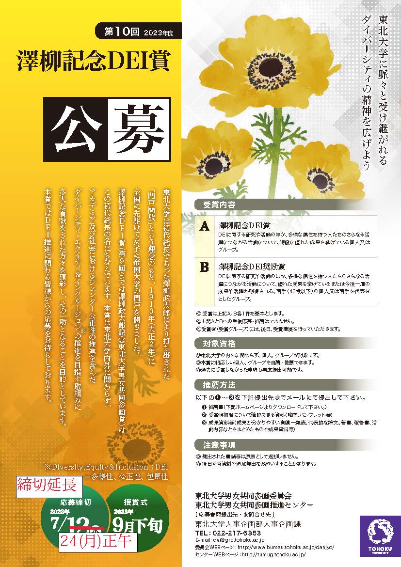 一覧 イベント ニュース 各種公募 お知らせ 2023年10月6日 【報告】第10回澤柳記念DEI賞 受賞者決定及び授賞式の報告 ニュース SA , 活動報告 2023年10月5日 【報告】田中真美DEI推進センター長が日本水産学会秋季大会で開催された男女共同参画ランチョンセミナーで講演を行いました(2023/9/21開催) ニュース 活動報告 2023年10月3日 【ご案内】読売新聞に大隅典子副学長のインタビュー記事が掲載されました。(2023/9/30掲載) ニュース 2023年9月29日 【ご案内】東北大学DEI推進センターの新ロゴマークが決定しました。 ニュース 2023年9月25日 【ご案内】田中真美DEI推進センター長(医工学研究科/工学研究科 教授)が【TOHOKU University Researcher in Focus】で紹介されました。(2023/9/25掲載) ニュース 2023年9月25日 【報告】第29回 TUMUG Online Lunch Meeting(2023/9/12 オンライン開催) ニュース 活動報告 2023年9月22日 【報告】女子学生向けプログラミング・データサイエンス オンラインコース【Pythonプログラミング with AI】(2023/8/29 開催) ニュース 活動報告 2023年9月11日 【報告】全国高等学校PTA連合会大会2023宮城大会 東北大学訪問(2023/8/24 開催) ニュース SA , 活動報告 2023年9月4日 【ご案内】朝日新聞朝刊「折々のことば」に大隅典子副学長の文章が引用されました。(2023/9/3掲載) ニュース 2023年9月1日 【報告】丹下ウメ博士開眼法要及び記念碑除幕式が行われました(2023/8/21) ニュース SA , 活動報告 2023年8月25日 【ご案内】日本初女子大学生誕生110周年記念ビール 8月26日より販売開始 ニュース 2023年8月25日 【ご案内】女子大生の日関連記事として、小仲美奈氏(工学研究科出身)のコラム記事が読売新聞オンライン版に掲載されました ニュース 前へ1 … 8 9 10 11 12 13 14 … 21次へ