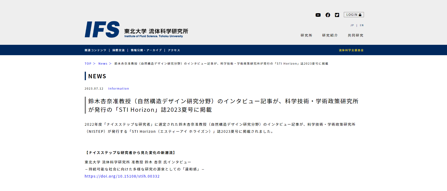 一覧 イベント ニュース 各種公募 お知らせ 2023年8月25日 【報告】「女子大生の日」記念 オンライン・オープンキャンパス ~自分らしく生きる力 -Be yourself- ~(2023/8/10オンライン開催) ニュース SA , 活動報告 2023年8月23日 【ご案内】7/26~27のオープンキャンパスでのSAの活動が読売新聞オンライン版に紹介されました ニュース 2023年8月23日 【報告】 サイエンス・アンバサダーと一緒に考える「研究者ってなに?」~SAオープンキャンパス編~ (2023/7/26-7/27開催) ニュース SA , 活動報告 2023年8月18日 【報告】こどもの貧困・社会イノベーションセミナー「現場から学ぶこどもの貧困」(2023/7/12 開催) ニュース 広報 2023年8月3日 【報告】2023年度 第1回・第2回 TUMUG Café online:科研費セミナー(2023/7/28、7/31オン ライン開催) ニュース 活動報告 2023年8月3日 【報告】第28回 TUMUG Online Lunch Meeting(2023/7/11 オンライン開催) ニュース 活動報告 2023年8月3日 【報告】第27回 TUMUG Online Lunch Meeting(2023/5/16 オンライン開催) ニュース 活動報告 2023年8月1日 【報告】仙台市政だより(令和5年8月号)「第46回 古今東西ぐんぐん行きます!東北大学サイエンス・アンバサダー編」掲載 ニュース SA , 活動報告 2023年7月21日 【ご案内】特設サイト「女子学生誕生110周年記念事業ウェブサイト」公開 ニュース 2023年7月21日 【ご案内】特設サイト「時代を駆ける東北大学の女性たちー日本初・女子大生誕生の地ー」第8章コンテンツを公開 ニュース 2023年7月13日 【ご案内】鈴木杏奈准教授(流体科学研究所)のインタビュー記事が、科学技術・学術政策研究所が発行の「STI Horizon」誌2023夏号に掲載 ニュース 2023年7月5日 【コラム】2022年度 東北大学優秀女性研究者賞「紫千代萩賞」受賞者3名のコラムを掲載しました。 ニュース 前へ1 … 9 10 11 12 13 14 15 … 21次へ