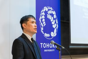 続いて、本学副学長(ダイバーシティ担当)およびセンター長を務める田中真美より、本学の取り組みについて報告がありました。昨年度東北大の教職員に実施したアンケート調査の分析結果の一部が紹介するとともに、新たな人事戦略として「加速支援パッケージ」の内容を発表しました。これは、日本初の「国際卓越研究大学」としての責務を果たすべく、現在約20%である女性研究者の比率を、今後25年間で40%まで引き上げるという目標達成に向け、従来の施策をさらに強化する人事戦略となります。