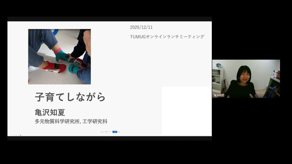 第40回のミーティングでは、DEI推進センターのTUMUG支援制度を利用された先生方から「子育てしながら」というテーマで、子育て中の先生方に話題提供をしていただきました。子育てと研究の両立に向けた工夫や経験が共有され、参加者の理解と交流が深まりました。多様な実践例は、今後の支援制度の活用に役立つ示唆となりました。プログラムは以下となります。