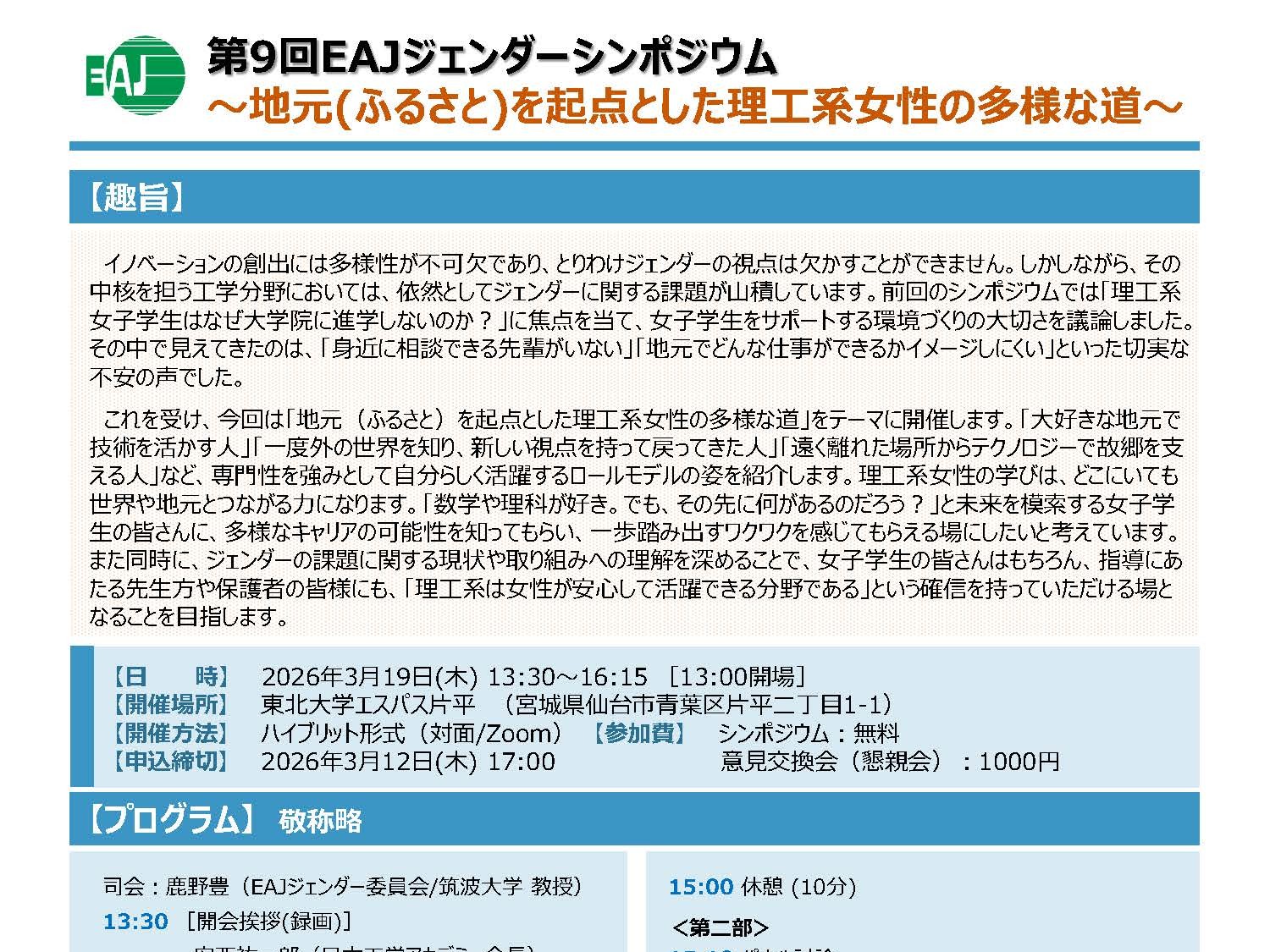 2026年2月10日 【イベント】第9回EAJジェンダーシンポジウム ~地元(ふるさと)を起点とした理工系女性の多様な道~(2026/3/19 ハイブリット開催) イベント 教員 , イベント , 一般 , 在学生 , 職員 , 教員連携