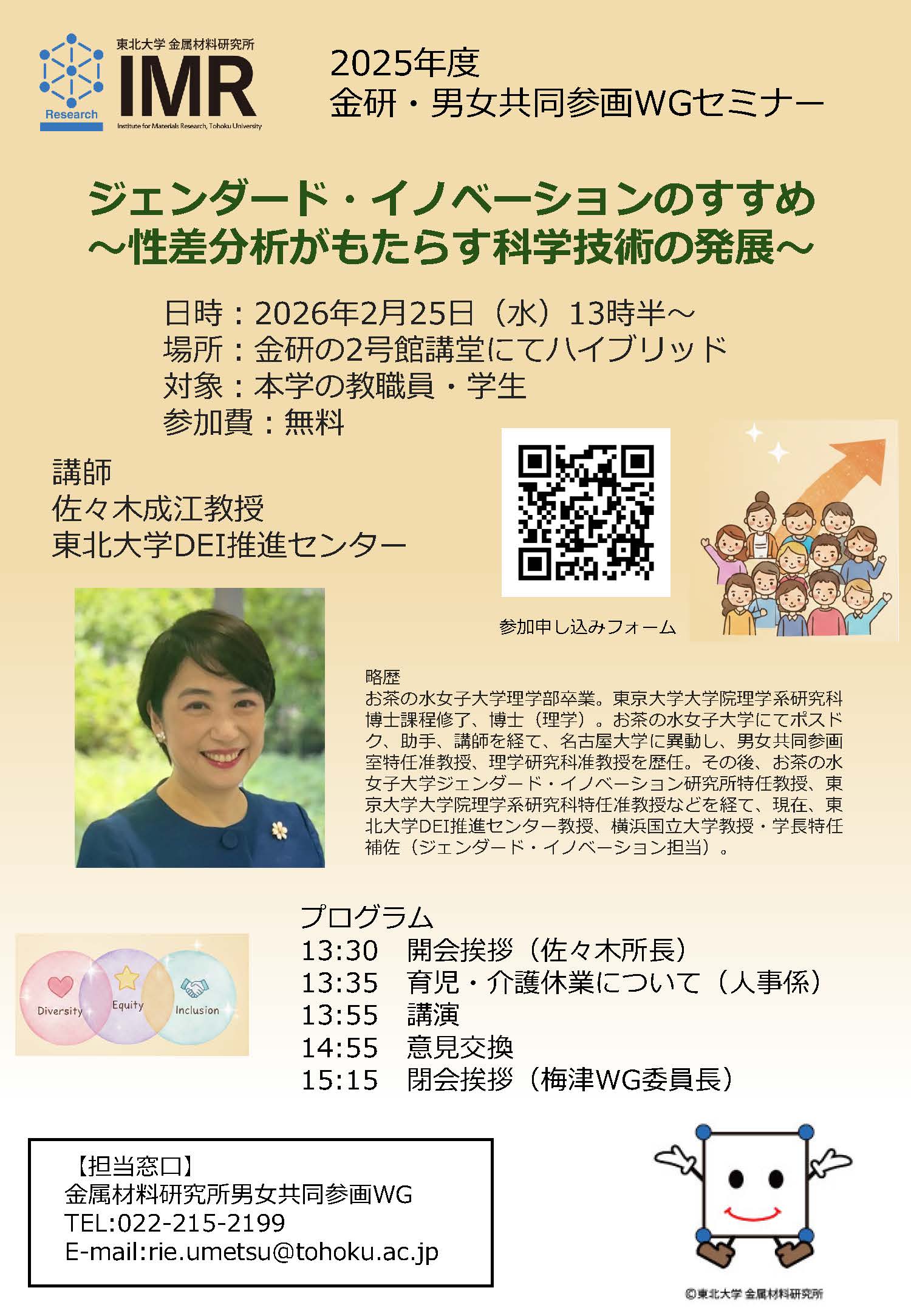 2026年2月6日 【イベント】2025年度金研・男女共同参画WGセミナー「ジェンダード・イノベーションのすすめ~性差分析がもたらす科学技術の発展~」(2026/2/25 開催) イベント 職員 , 教員連携 , GI , 教員 , イベント , 在学生